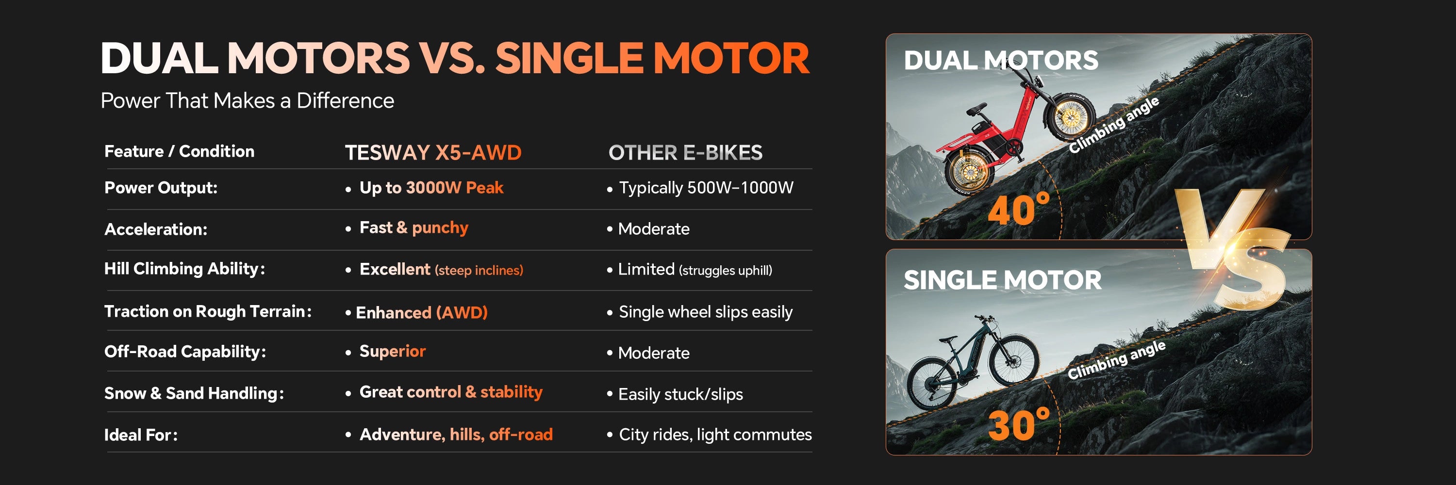 Ride farther and conquer any terrain with the TESWAY X5 AWD e-bike. Its industry-leading 200-mile range and dual-motor all-wheel drive deliver unstoppable performance on city streets or mountain trails.