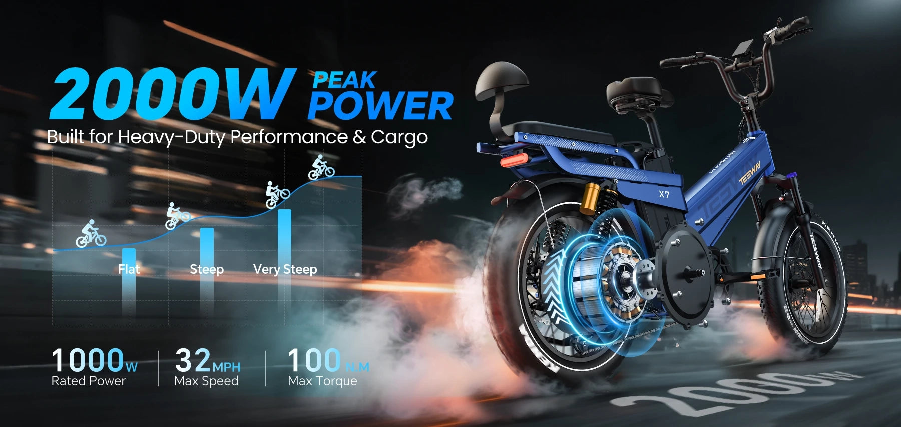 Unleash unstoppable cargo power - 2000W peak motor and 100Nm torque conquer heavy loads and steep hills with ease.