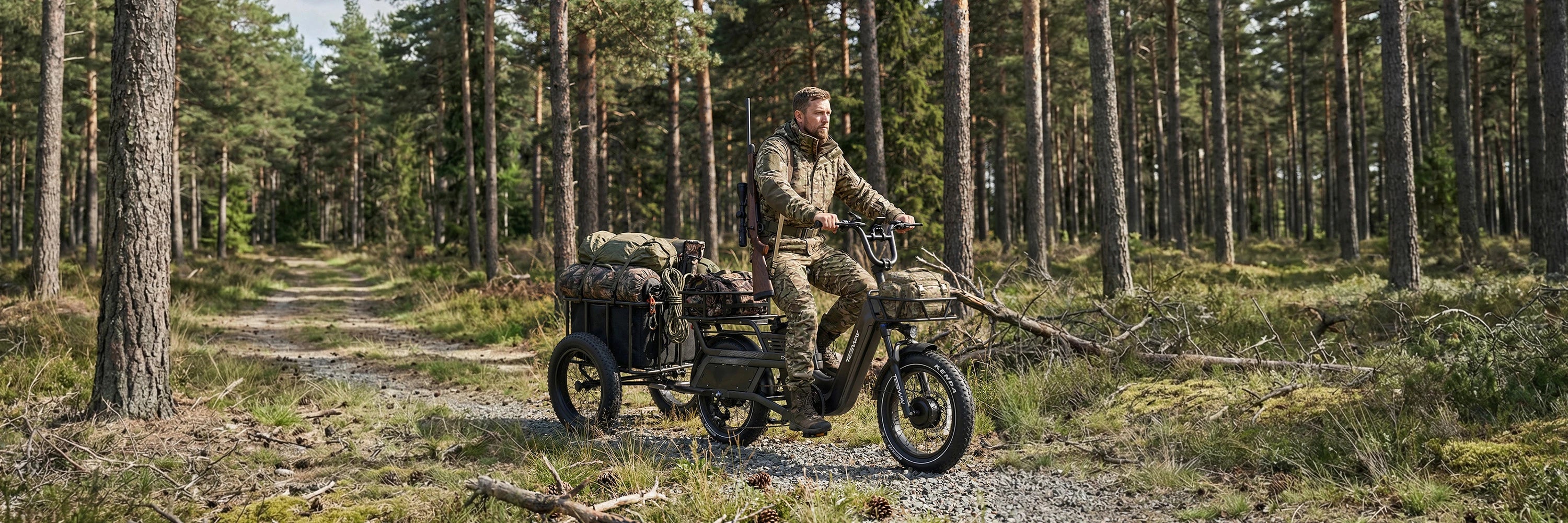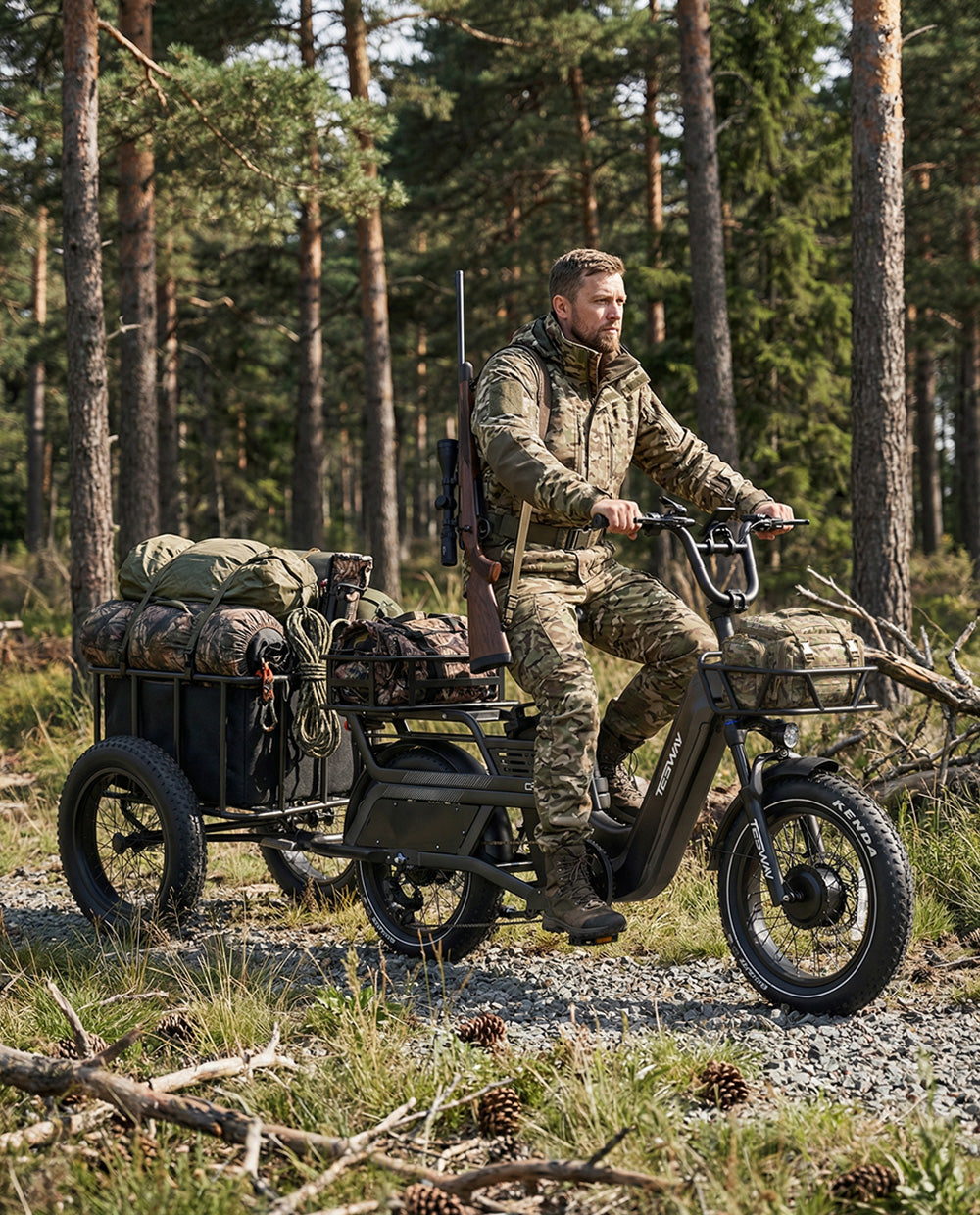 Designed for hunting environments where control and capability matter most, the TESWAY C5 AWD Cargo E-Bike uses a dual-motor all-wheel-drive system to deliver steady traction across rough and uneven terrain. Powered by a high-capacity 52V 60Ah battery, it supports long-distance access—up to 200 miles of range—while its cargo-focused design allows you to carry essential gear efficiently into remote areas.