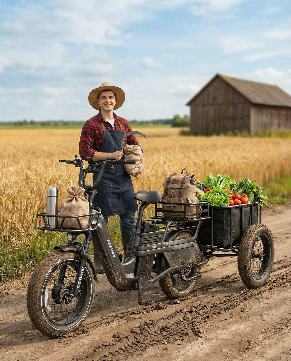Designed for daily farm tasks and utility work, the TESWAY C5 AWD Cargo E-Bike delivers reliable traction with its dual-motor drive system, even when carrying tools, feed, or supplies. The 52V 60Ah battery offers up to 200 miles of range, supporting long workdays across fields and mixed terrain as a practical electric alternative to small utility vehicles.