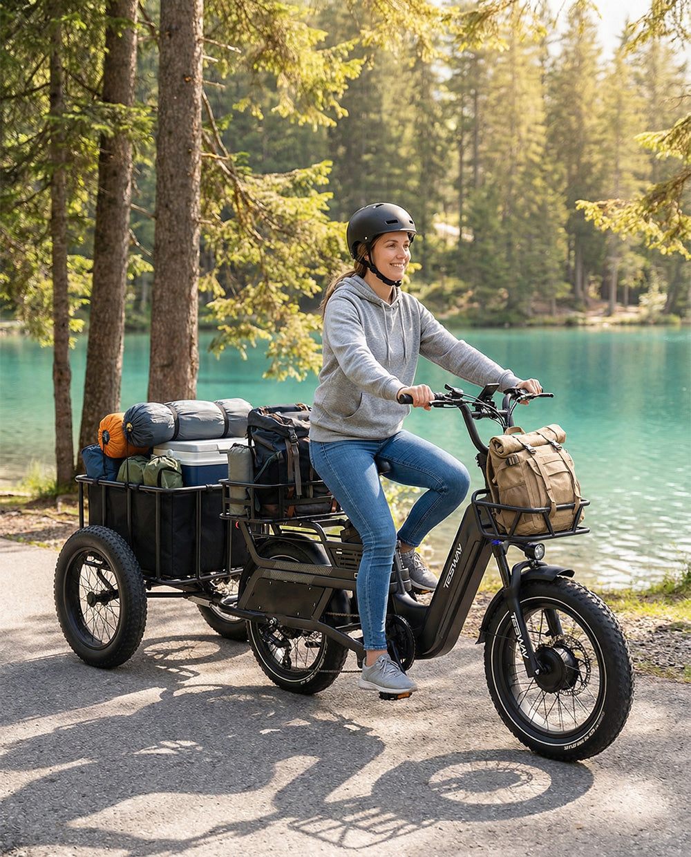 Built for extended camping trips and long-distance travel, the TESWAY C5 AWD Cargo E-Bike combines a dual-motor all-wheel-drive system with a high-capacity 52V 60Ah battery, delivering strong climbing power and a maximum range of up to 200 miles. With the ability to carry full camping gear comfortably and ride confidently over varied terrain, it’s made for riders who go farther—and stay longer.