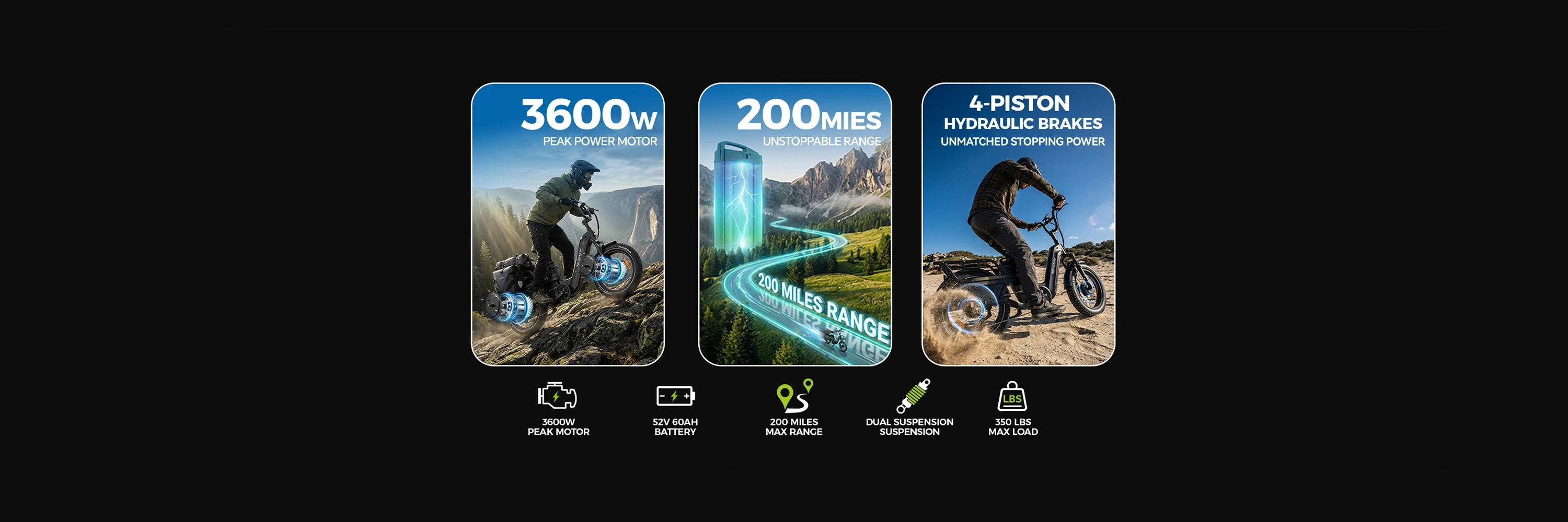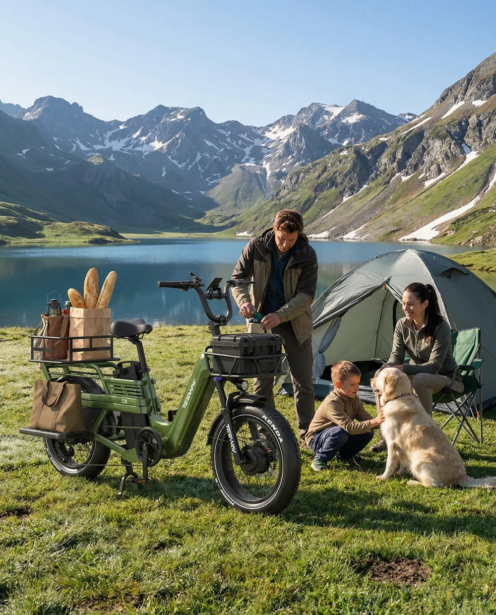 Designed for family camping and extended outdoor trips, the TESWAY C5 AWD Cargo E-Bike combines a dual-motor drive system with a high-capacity 52V 60Ah battery, providing steady power and a maximum range of up to 200 miles. With the ability to carry camping essentials comfortably and handle long distances with confidence, it makes family adventures simpler, longer, and more enjoyable.
