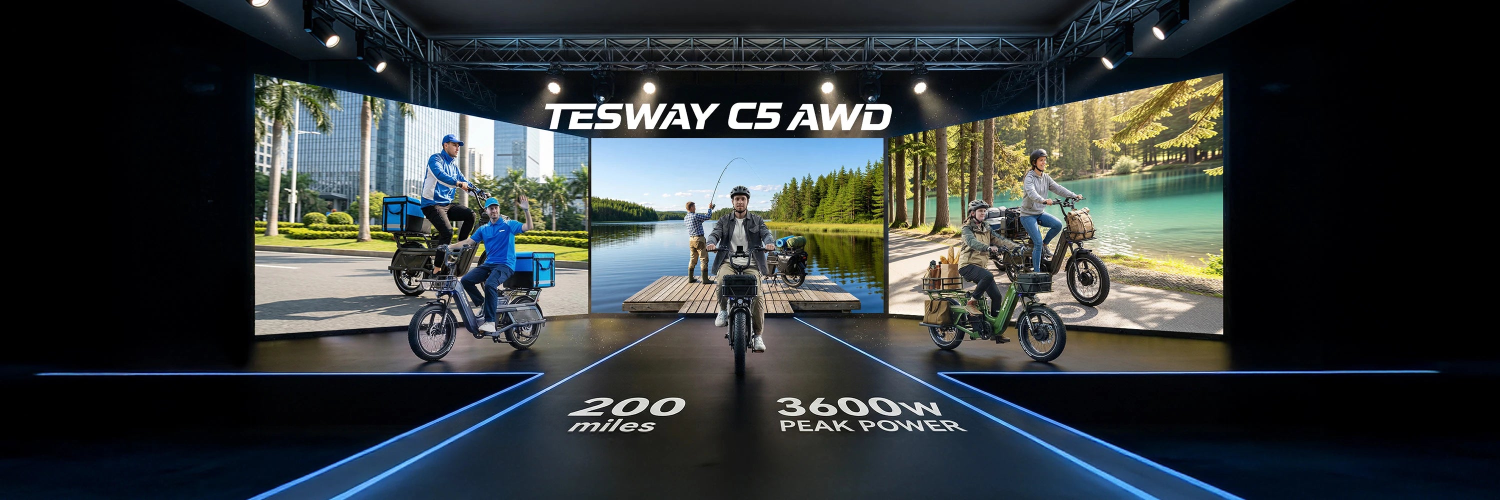 Built for outdoor fishing and heavy cargo use, the TESWAY C5 AWD Cargo E-Bike features a powerful dual-motor all-wheel-drive system and a massive 52V 60Ah battery, delivering exceptional torque and a maximum range of up to 200 miles.