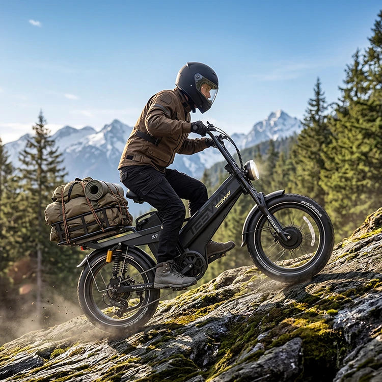 The X7 AWD is ideal for urban commuting, off-road trails, and long-distance touring. Its full suspension and 20″×4.0″ fat tires offer stability and comfort on rough roads, sand, or light trails.